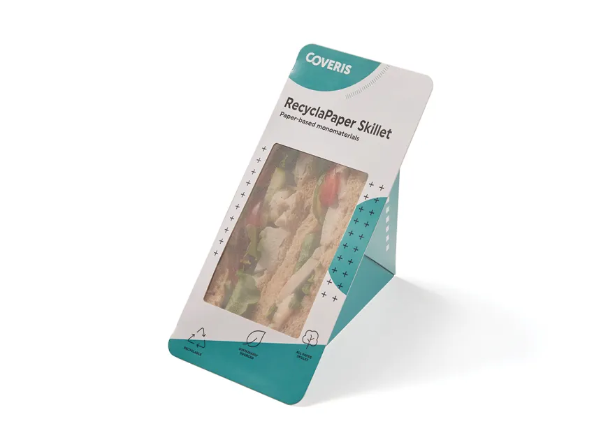 Launching at lunch!, the newest addition to Coveris‘ award-winning sandwich skillet range is the monomaterial RecyclaPaper. RecyclaPaper is a fully paper-based, sustainably sourced and recyclable sandwich skillet featuring a translucent window enabling good consumer product visibility. Offering an alternative to plastic-lined skillets, RecylaPaper’s window is paper-based and using the latest paper monomaterial technology, delivers the same product protection and shelf life