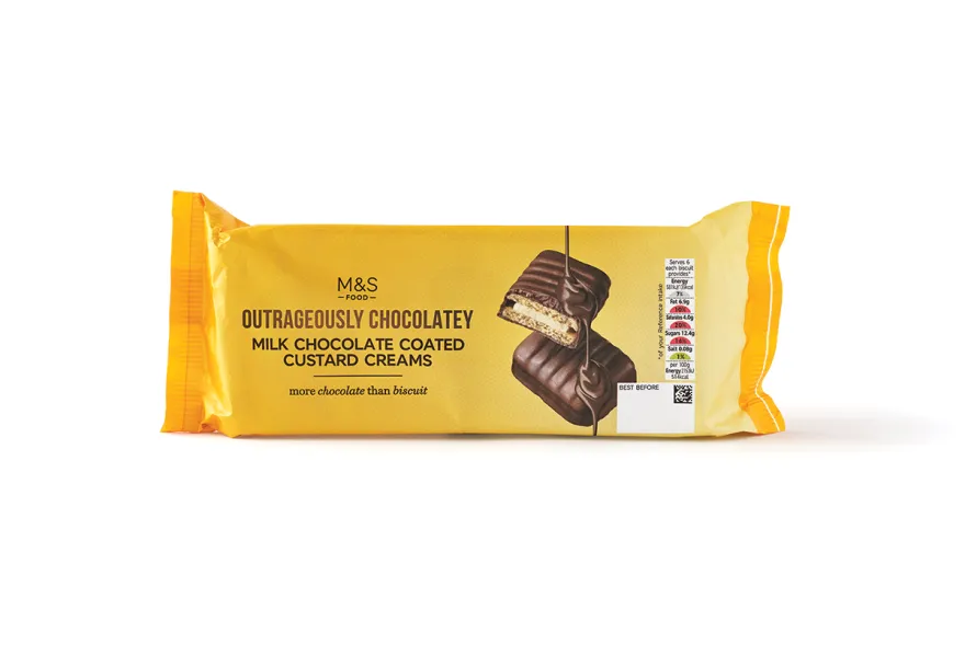 - Flexo Surface Print on Film Wide (>1000mm): M&S Outrageously Chocolatey Milk Chocolate Custard Creams