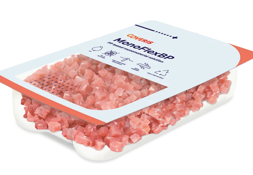 For high oxygen barrier trays made of MonoFlexBP, Coveris offers a PET and PA-free lidding film that seals, peels and can be resealed on PP. The resealable lid has a high gas barrier, as is required for fresh food.